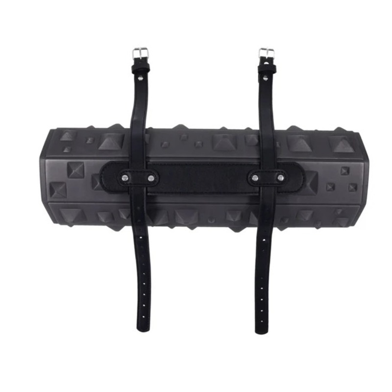 Kneel, sit, or lie across its surface, the longer you remain, the deeper the pressure builds, transforming restraint into obedience and discomfort into devotion. Each corner is fitted with silver grommet holes for use with cuffs or rope, keeping the submissive securely in place as intensity mounts. When the scene is over, the mat rolls up neatly for storage in its black faux leather, dual-buckled holster. Built to test endurance and amplify control, it’s the ultimate tool for posture and pressure play.
